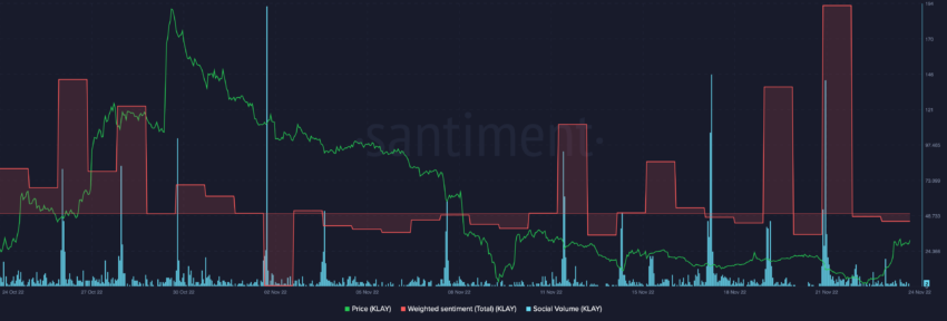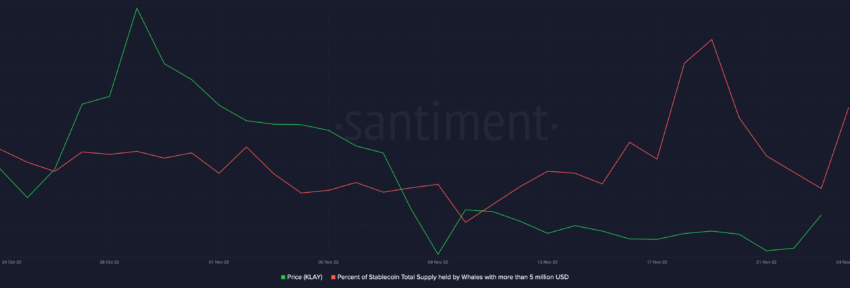 Khối lượng giao dịch của KLAY đã tăng đáng kể trong 24 giờ, đạt mức 193.61% vào ngày 24/11. Trong khi hoạt động phát triển tiếp tục vượt trội so với các số liệu on-chain khác, cá voi đã thực hiện một số động thái đẩy giá KLAY lên cao trong thời gian ngắn.
