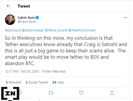 Mới đây, trên twitter cá nhân của Calvin Ayre ngày 25/10/2020, nhà sáng lập CoinGeek, ngụ ý Wright là người tạo Bitcoin và suy luận đó là nước cờ cho một sự gian lận.