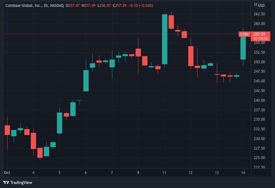 Coinbase đã hoạt động tốt trong suốt đầu tháng 10 cho đến nay. Vào đầu tháng với mức giá 232 USD, tới ngày 4 tháng 10 giá COIN đã xuống còn 225 USD. Tuy nhiên, đến ngày 5 tháng 10, giá COIN đã bắt đầu vào đà tăng và liên tục tạo gap trong các ngày 5 tháng 10, 6 tháng 10 vào gần đây nhất là 14 tháng 10. Trong 2 tuần đầu của tháng 10, cổ phiếu COIN đã tăng 12% và hiện đang giao dịch ở mức 260 USD.