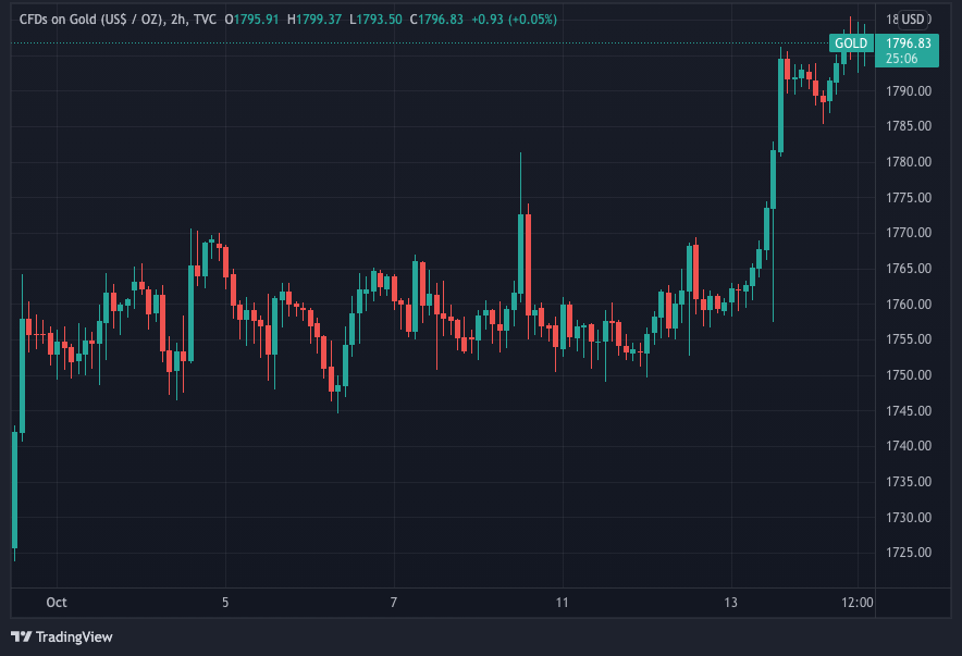 Tháng 10 cũng là một tháng thịnh vượng cho những nhà đầu tư nắm giữ vàng. Giá vàng đã tăng từ 1,725 USD vào ngày 30 tháng 9 lên 1,755 USD vào ngày 1 tháng 10. Vàng đã duy trì vùng giá này trong gần 2 tuần và tới ngày 13 tháng 10, giá vàng đã tăng vọt, vượt qua mức 1,790 USD lên gần 1,800 USD cũng là mức giá hiện tại của vàng.
