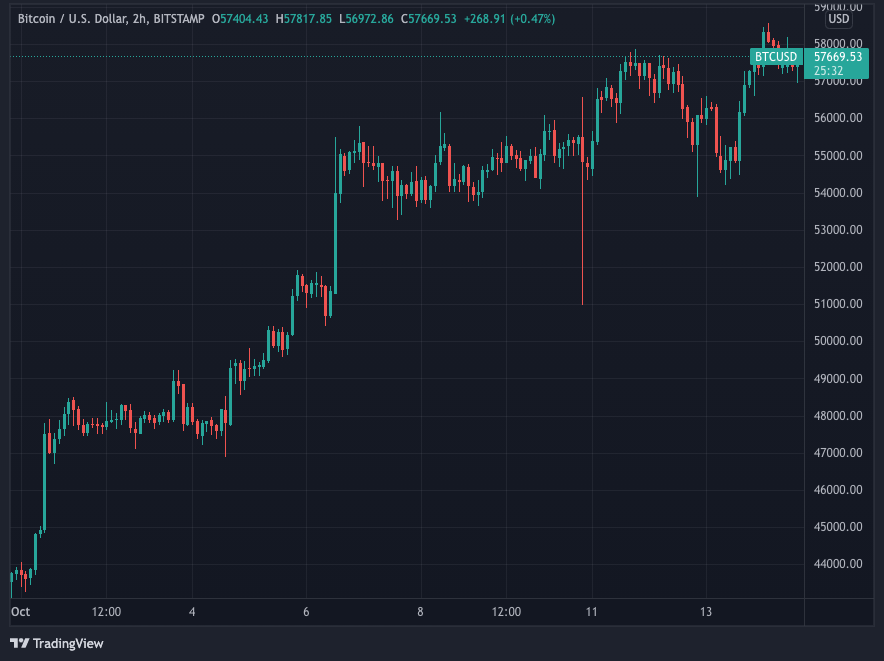 Bitcoin đã có sự khởi sắc trong tháng 10 này. Bắt đầu từ mức giá 44,000 USD, BTC đã chạm ngưỡng kháng cự ở mức 48,000 USD vào cuối ngày 1 tháng 10. BTC đã giữ lại được mức kháng cự này tới ngày 4 tháng 10. Giá BTC đã tăng lên kể từ đó. Ngày 6 tháng 10, giá BTC đã tăng vọt từ 51,000 USD lên gần 55,000 USD và đã duy trì được vùng giá 53,000 đến 55,000 USD tới ngày 11 tháng 10.