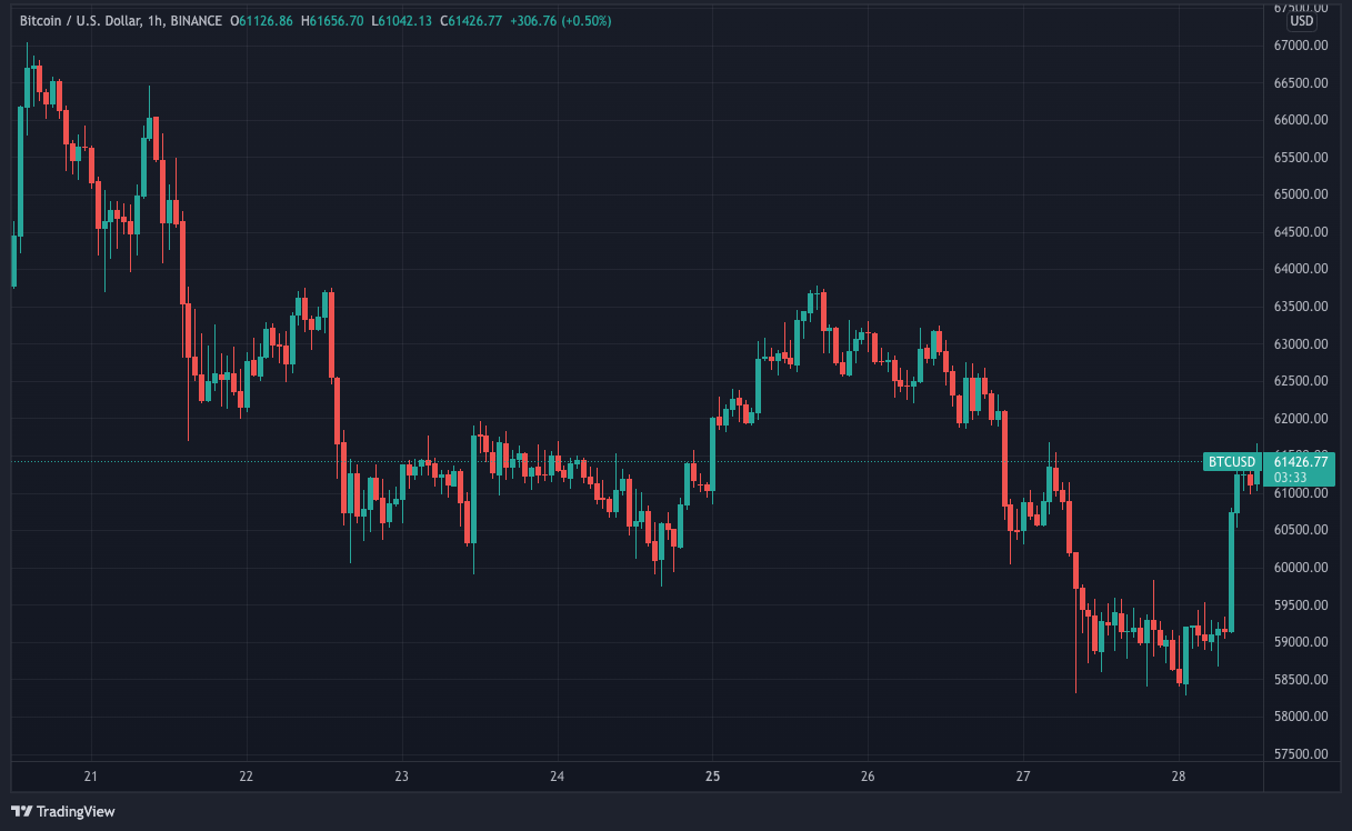 Bitcoin (BTC) đã bán tháo trong tuần này sau một tuần trước đầy hưng phấn khi thiết lập mức đỉnh lịch sử mới. Sau khi phá vỡ mốc giá 67,000 USD vào ngày 20 tháng 10, giá BTC bắt đầu bị bán mạnh. Đã có sự giằng co giữa bên bán và bên mua xung quanh vùng 66,000 USD – 67,000 USD, tuy nhiên bên bán đã thắng khiến giá BTC giảm xuống còn 61,000 USD vào ngày 23 tháng 10. Áp lực mua đã quay lại vào ngày 24 tháng 10, đưa giá BTC về gần 64,000 USD vào ngày 25 tháng 10. Tới ngày 28 tháng 10, giá BTC đã quay đầu rớt xuống dưới mốc 60,000 USD tuy nhiên nó đã nhanh chóng quay trở lại lên trên 61,000 USD.