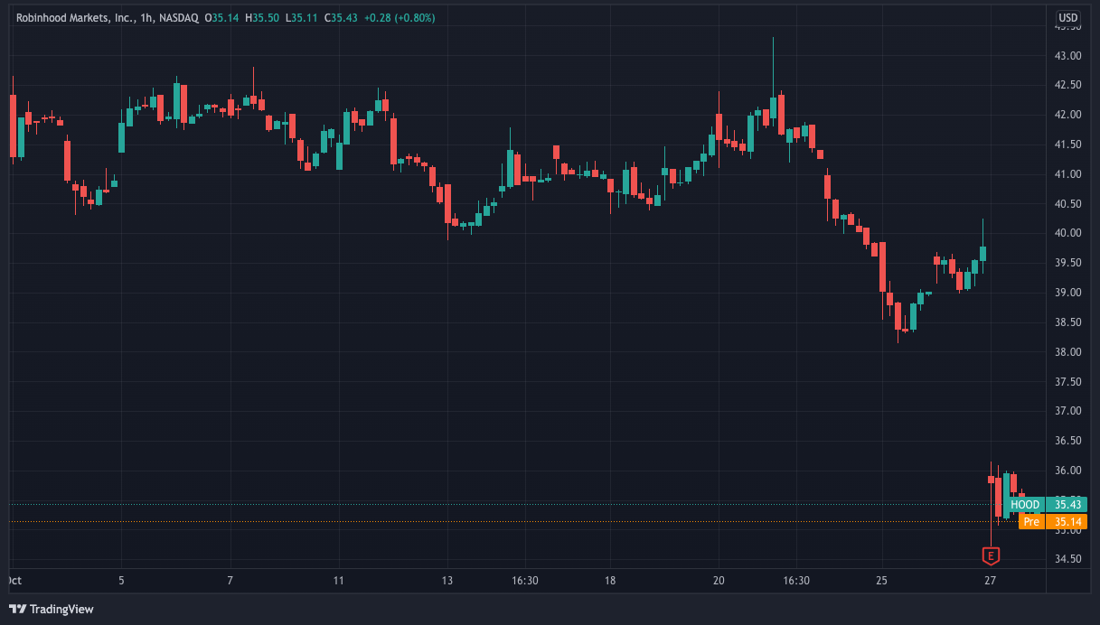 Mặc dù có một tháng 10 suôn sẻ, nhưng giá cổ phiếu Robinhood đã phải vật lộn đáng kể trong tuần qua. Bắt đầu bước vào tháng 10 với mức giá 42 USD và nó đã có sự rung lắc nhẹ xung quanh mức giá này cho tới ngày 11 tháng 10. Giá HOOD đã giảm vào ngày 12 tháng 10, chạm mức hỗ trợ 40 USD vào ngày 13 tháng 10 và giao dịch quanh mức 41 – 42 USD trong vài sau đó. HOOD đã không giữ được vùng giá này và tới ngày 21 tháng 10, giá HOOD đã tiếp tục giảm xuống khoảng 38 USD trước khi tìm thấy hỗ trợ đưa nó về lại gần 40 USD. Nhưng sau khi công bố kết quả kinh doanh của Q3 không đạt như kỳ vọng, giá HOOD đã giảm xuống còn 36 USD vào ngày 27 tháng 10.
