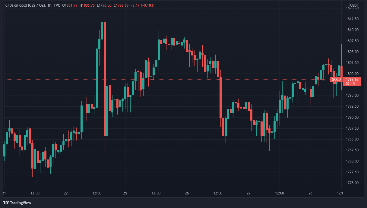 Thị trường vàng vẫn đang trong một xu hướng tăng với nhiều yếu tố cơ bản hỗ trợ. Sau khi giao dịch quanh mức 1,780 USD vào ngày 21 tháng 10, giá vàng đã tăng vọt lên 1,812 USD vào ngày hôm sau. Nhưng chỉ trong vài giờ sau đó lại giảm xuống 1,785 USD trước khi ổn định ở mức 1,792 USD. Ngày 25 tháng 10, giá vàng lại tăng lên 1,807 USD, nhưng nó đã giảm mạnh về lại mức hỗ trợ 1,785 USD vào ngày 26 tháng 10. Sau đó giá vàng đã tăng trở lại và giao dịch quanh mức 1,800 USD vào ngày 28 tháng 10.