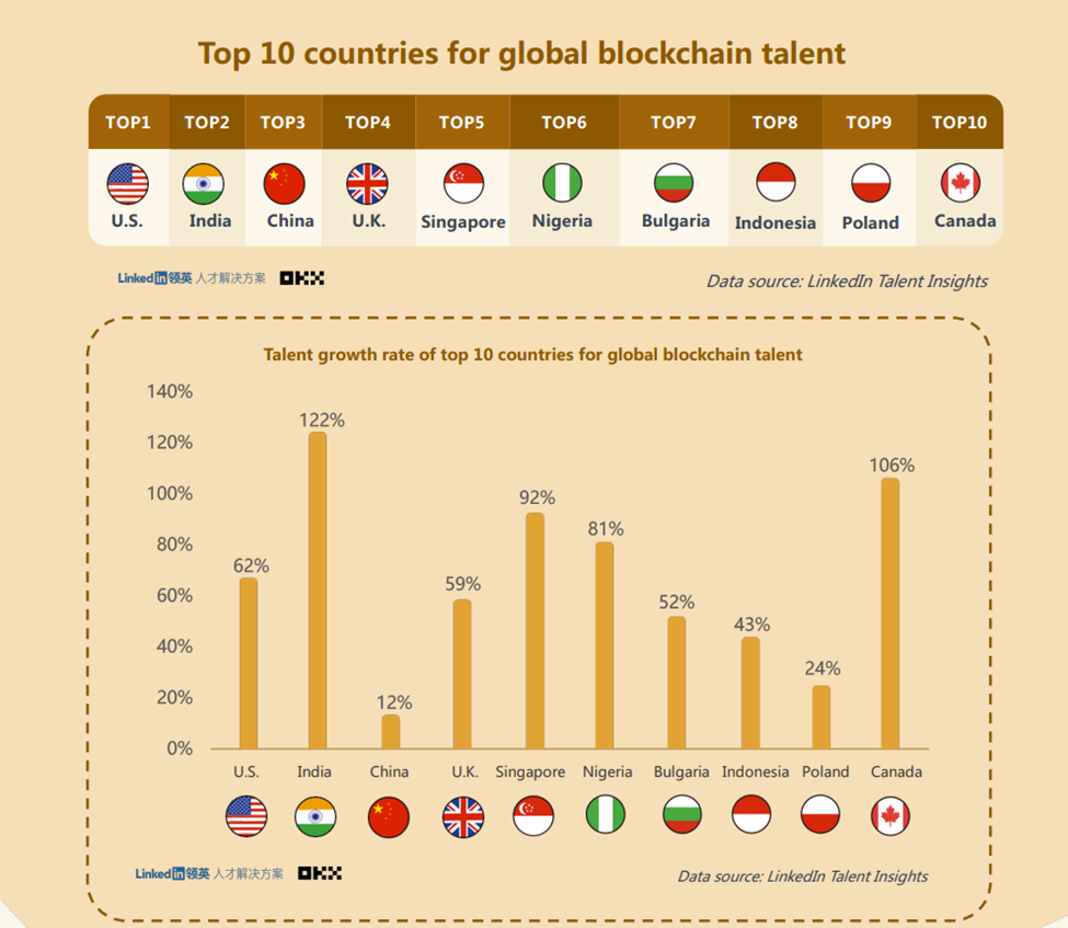 Theo một báo cáo thực hiện bởi LinkedIn và sàn giao dịch OKX đã tổng hợp mẫu từ 180 quốc gia trong thời gian từ tháng 1/2019 đến tháng 6/2022 đã cho thấy nguồn cung nhân sự ngành blockchain trong Q2/2022 tăng 76% so với cùng quý năm ngoái. Trong đó, Mỹ, Ấn Độ và Trung Quốc là ba quốc gia có nguồn cung nhân sự cao nhất trong ngành. Đồng thời, Ấn Độ và Canada có tỷ lệ nhân sự gia tăng nhanh chóng lần lượt tà 122% và 106%. Ngược lại, Trung Quốc là quốc gia có tỷ lệ tăng trưởng nhân sự thấp nhất, chỉ 12%.