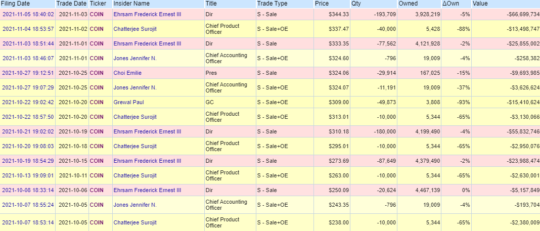 Nhiều cổ đông quan trọng tại sàn giao dịch tiền điện tử Coinbase lại tiếp tục bán cổ phần để kiếm lời khủng. Điều này được xác nhận bởi trang chuyên thống kê OpenInsider có liên kết đến báo cáo tài chính của sàn giao dịch cho Ủy ban Chứng khoán và Giao dịch Mỹ (SEC). Nếu quan sát dưới đây, từ đầu tháng 10, ban lãnh đạo của Coinbase đã bán hơn 200 triệu USD cổ phiếu COIN.