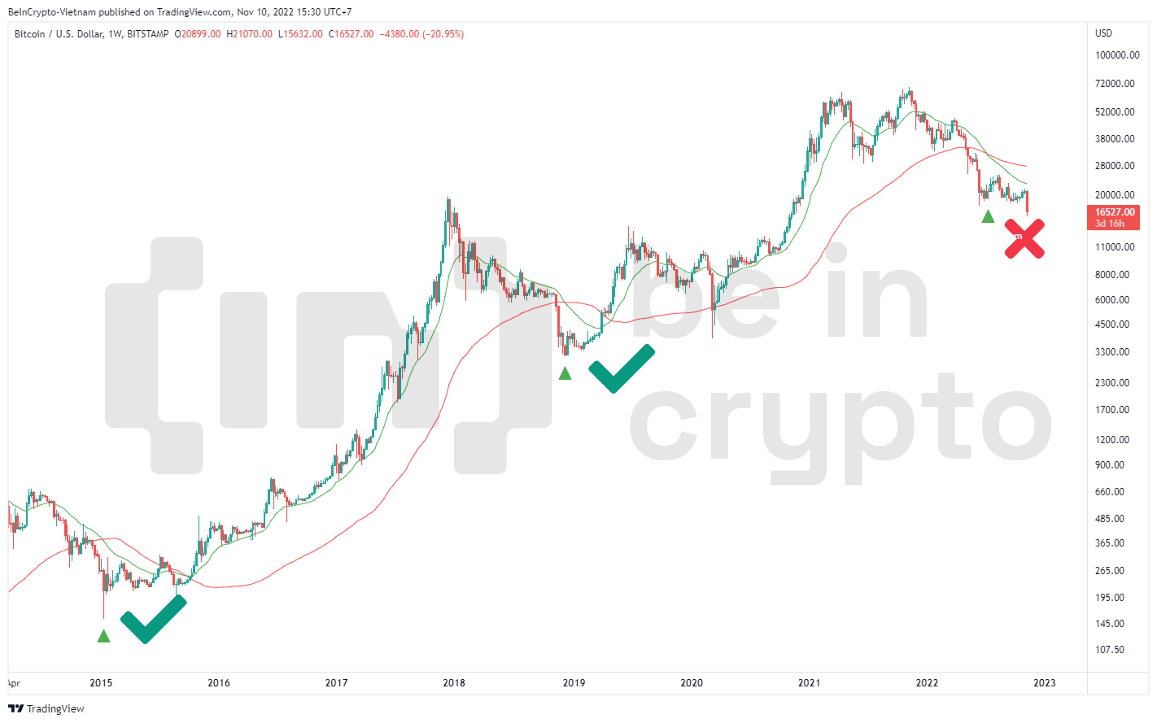 Giao cắt này từng dự báo chính xác những mức giá thấp nhất của downtrend. Tuy nhiên, mô hình kỹ thuật này đã không có tác dụng dự báo trong năm 2022 này. Hiện giá BTC đã phá vỡ mức dự báo của Pi Cycle Bottom.