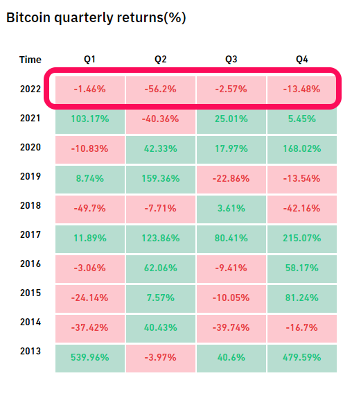 Q4/2022 vẫn đang tiếp diễn, nhưng với tình hình ảm đạm hiện nay thì khả năng cao Bitcoin sẽ cho hiệu suất âm bốn quý liên tiếp. Đây là lần đầu tiên trong lịch sử điều này diễn ra.