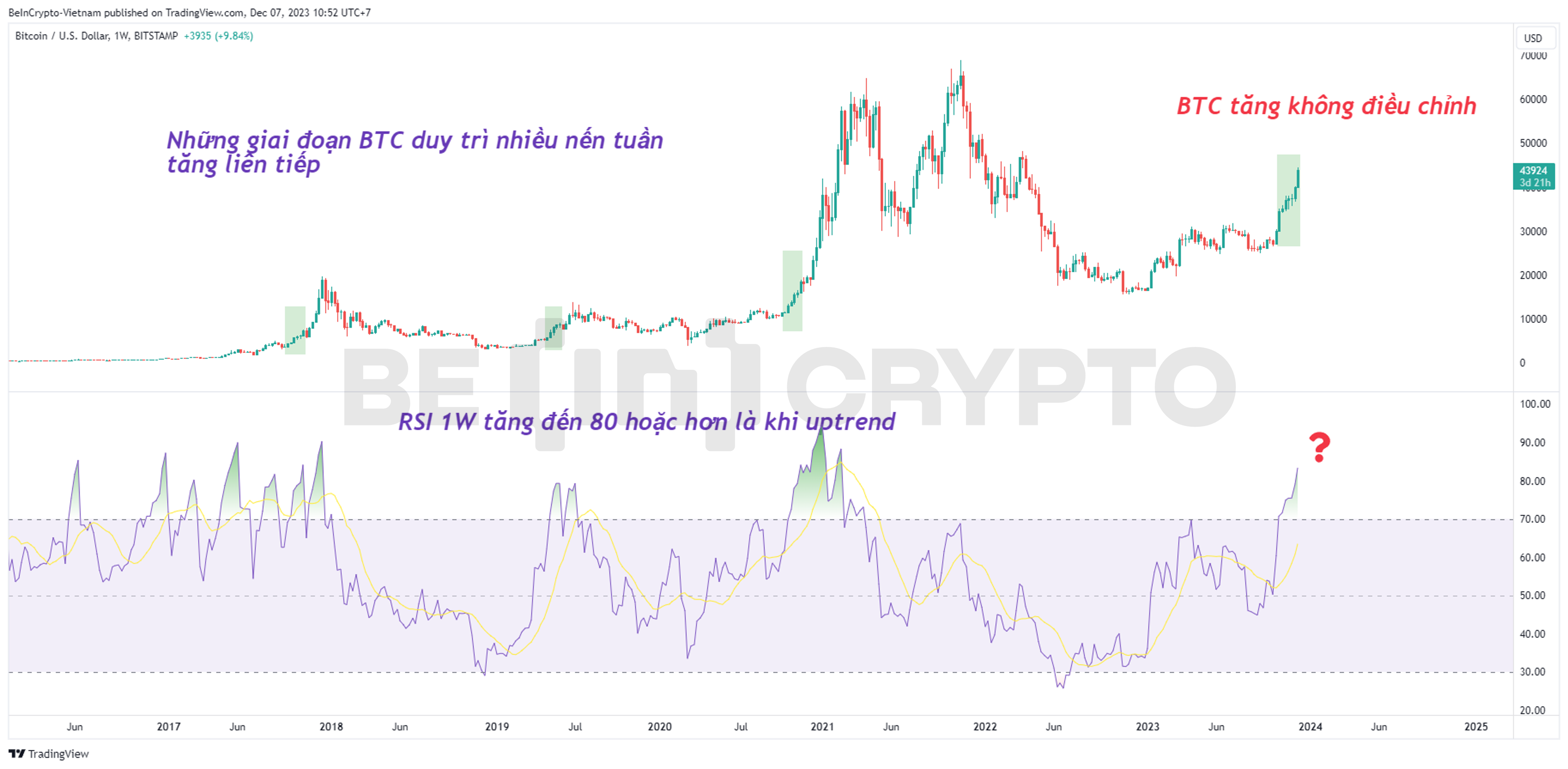 - Quan sát giá BTC khung tuần với chỉ báo RSI, có thể thấy có rất ít giai đoạn nào mà RSI chạm 80 hoặc vượt 80 điểm như hiện nay. Giá BTC khi đó cũng thường đi kèm với hành vi giá đóng nến tuần xanh 6-7 tuần liên tiếp mà không điều chỉnh. 2 tín hiệu này kết hợp với nhau như muốn gợi ý rằng BTC đã bước vào quá trình lập đỉnh mới.