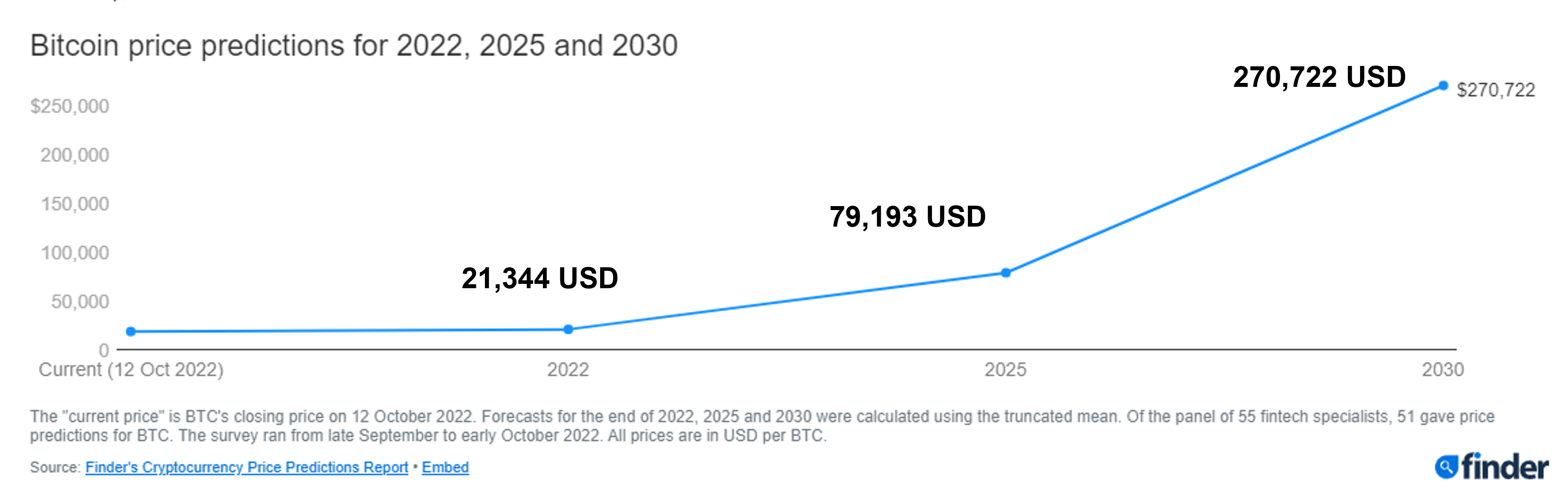 Các chuyên gia dự đoán giá Bitcoin có khả năng đạt 21,344 USD cuối năm 2022; đạt 79,193 USD cuối năm 2025 và đạt 270,722 USD cuối năm 2030.