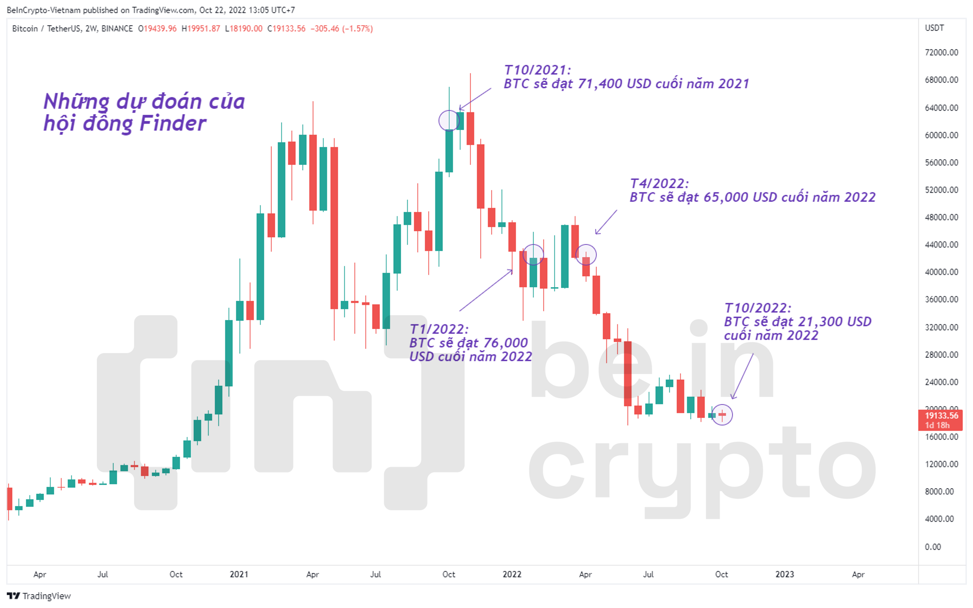 - Điều thú vị là các chuyên gia trong T10/2022 này bắt đầu thay đổi thái độ. Họ không còn kỳ vọng giá sẽ tăng nữa mà chỉ dừng lại ở khoảng 21,000 USD vào cuối năm 2022. Nghĩa là dự đoán giá Bitcoin chỉ chênh lệch chưa tới 15% so với giá hiện tại. Và dự đoán cũng “khiêm tốn” hơn rất nhiều so với những lần trước đó.