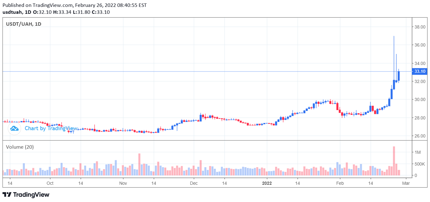 Cho đến thời điểm bài viết, giá USDT/UAH hơn 11% so với mức ổn định trước đó. Và tình trạng này đã kéo dài gần một tuần nay. Người dân lựa chọn USDT vì tính ổn định của nó để cất tài sản. USDT có đủ những đặc tính của một đồng tiền mã hóa như Bitcoin nhưng không biến động mạnh như Bitcoin. (nếu họ mua BTC vào một tháng trước thì có thể đã mất 10 ~ 20% giá trị, nhưng USDT thì không).