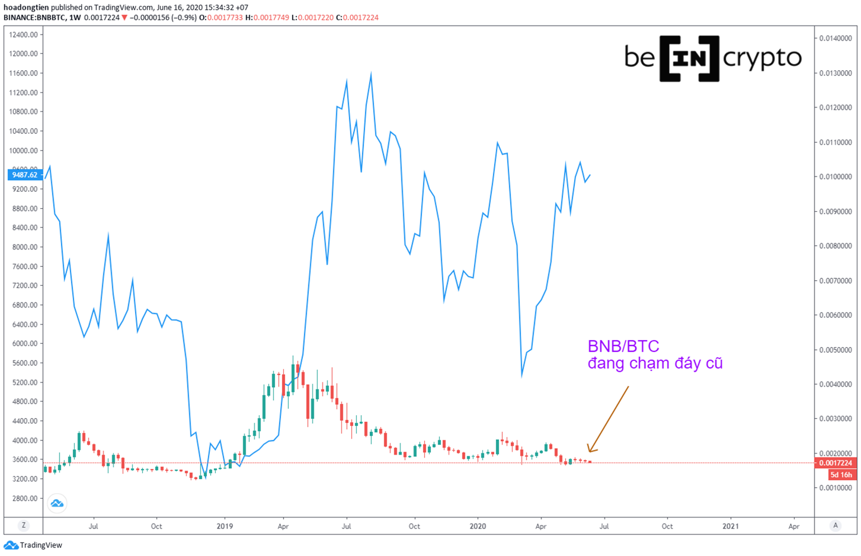 Từ đầu năm 2020, BNB/BTC cũng có vài biến động đáng kể. Nhưng cuối cùng cũng trở về đáy cũ. Nếu dưới mức này, thật khó xác định liệu giá sẽ còn thấp tới đâu.