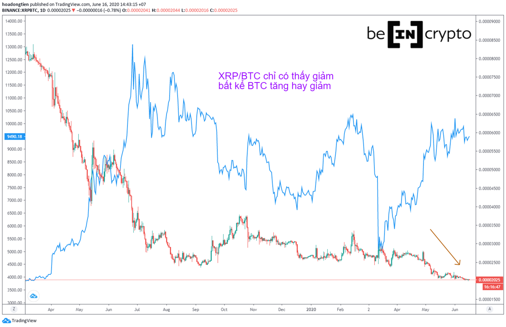 Thật khó hình dung, nếu xu hướng này tiếp diễn, số phận của XRP/BTC sẽ đi tới đâu. Vì vị trí này gần như là kịch đáy.