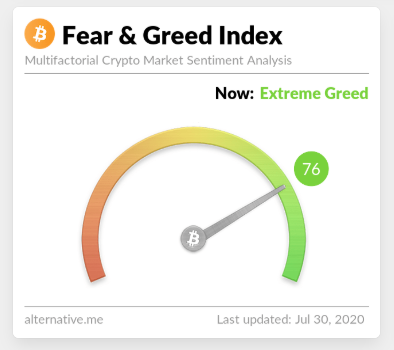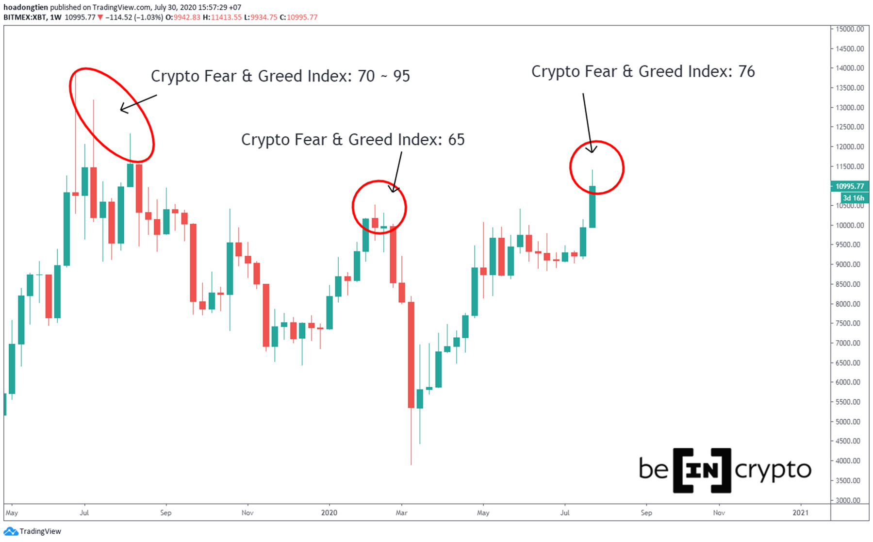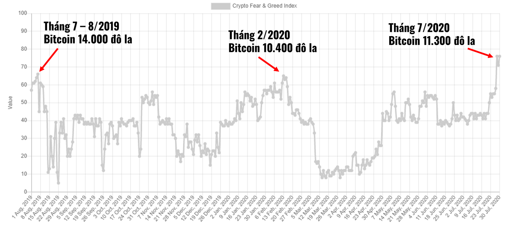 - Nhìn lại quá khứ, hồi tháng 7-8/2019, khi Bitcoin đạt đến 14.000 đô la, chỉ số “Tham lam và sợ hãi” dao động từ 70 đến 95. Và sau đó giá đã sụt giảm đến 50%.