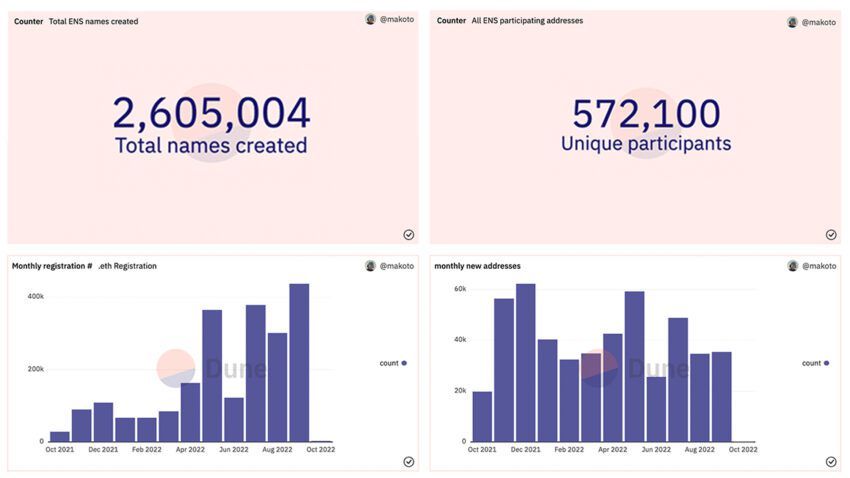 Theo dữ liệu do ENS Domains tổng hợp, lượt đăng ký đã tăng 57% trong tháng 9, từ mức 301,000 của tháng trước. Kể từ tháng 5, số lượng tên miền ENS được đăng ký đã tăng hơn gấp đôi lên 2.6 triệu. Trong khi đó trước đây, giao thức này phải mất 5 năm để đạt được con số 1 triệu.