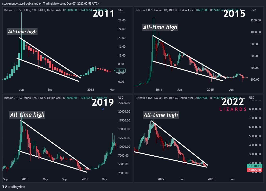 Nhiều KOL đồng quan điểm rằng đường giá năm 2022 nhiều nét tương đồng với 2015 nhất. Nó tương đồng cả về nhịp giảm và thời gian giảm của mỗi nhịp. Nếu nét tương đồng này còn tiếp diễn, có thể giá BTC sẽ sideway khá lâu như thời điểm năm 2015 sau đó mới tăng trở lại.