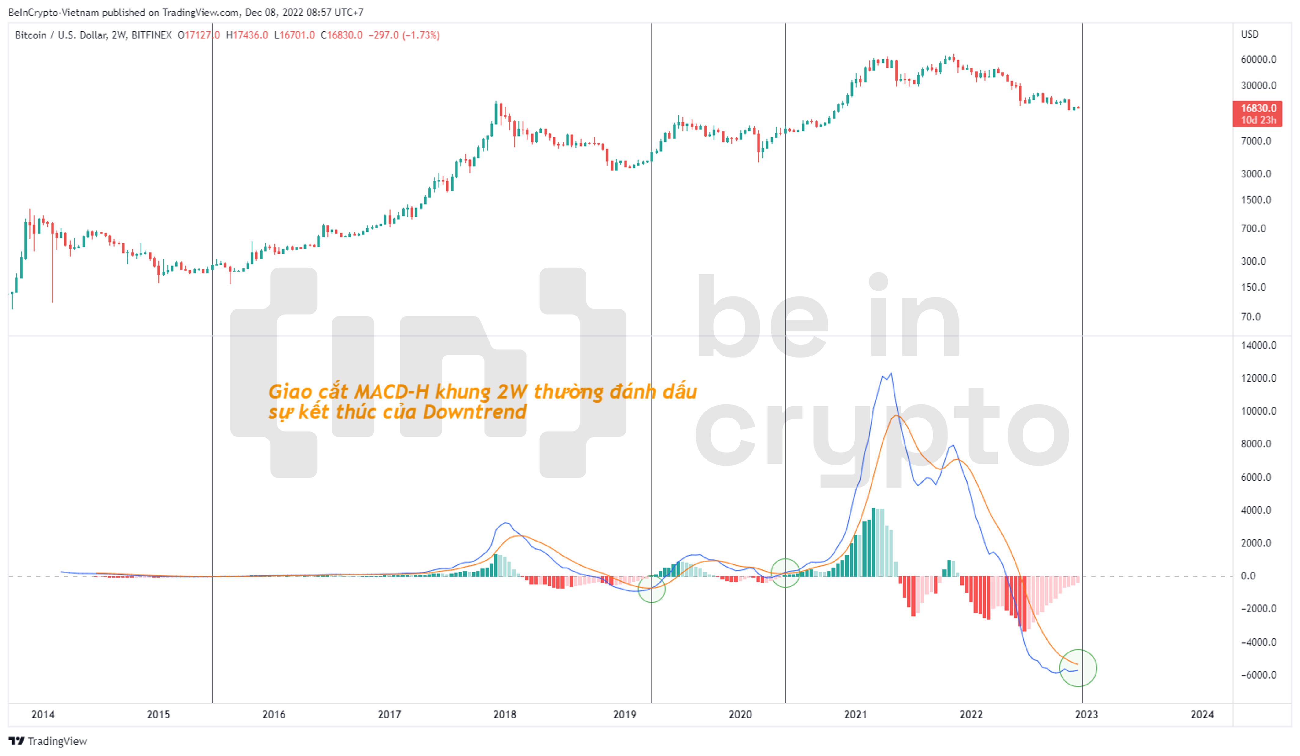 Quan sát lịch sử, chúng ta sẽ nhận thấy giao cắt giữa MACD Line và Signal Line khung 2 tuần thường là đánh dấu kết thúc một downtrend. Và thông thường, đây sẽ là một tín hiệu để xác định việc Bitcoin lập đáy.
