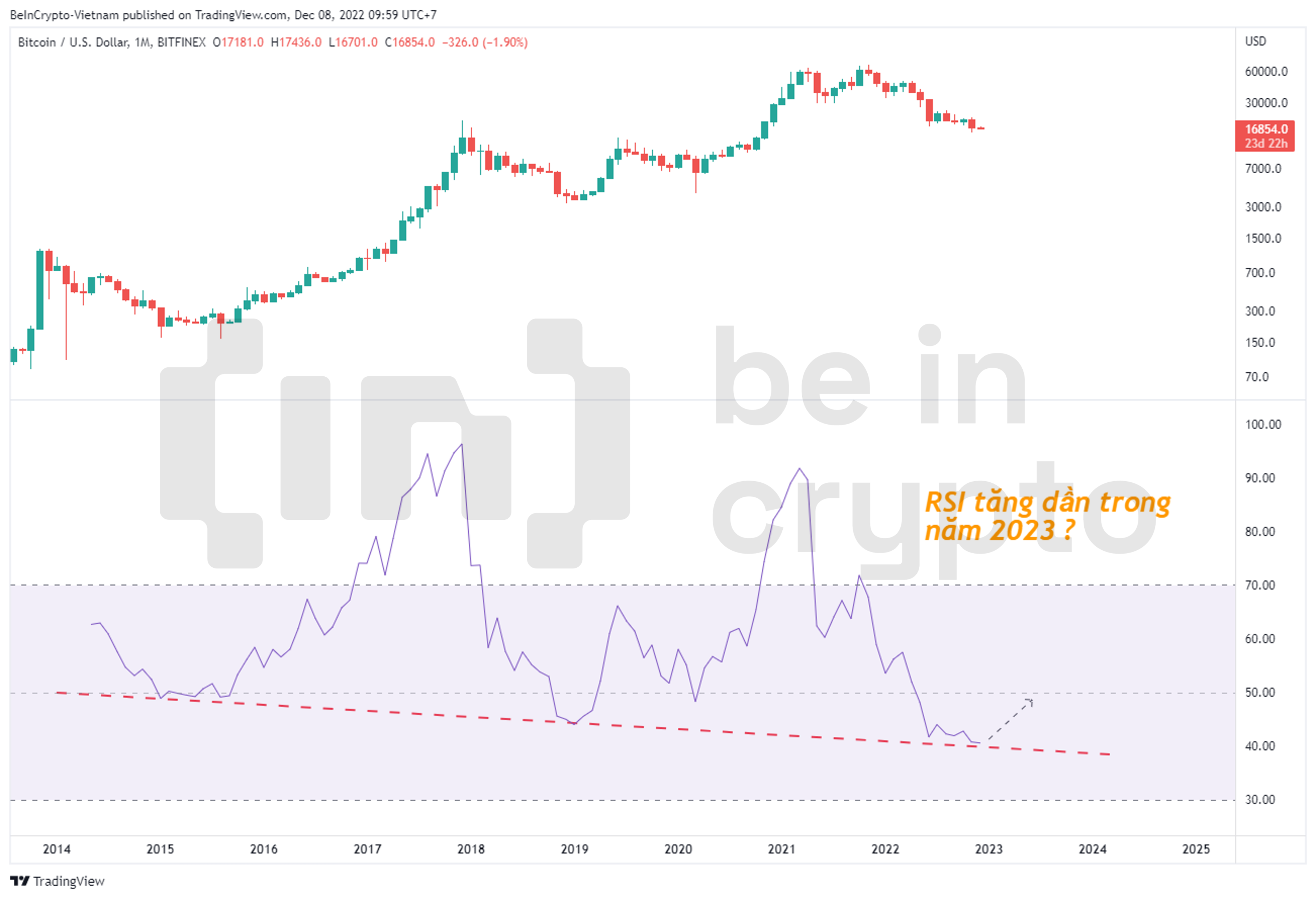 RSI tháng đang ở mức thấp nhất lịch sử giá Bitcoin. Nhưng tại đây, RSI cũng đang tiếp cận đường trendline hỗ trợ của gần 10 năm qua. Do đó, RSI có cơ sở để tăng trở lại trong năm 2023. Sự suy giảm cả năm qua thật sự rất nghiệm trọng, nhưng chỉ số sức mạnh tương đối đang nói rằng lực bán đang chạm ngưỡng.