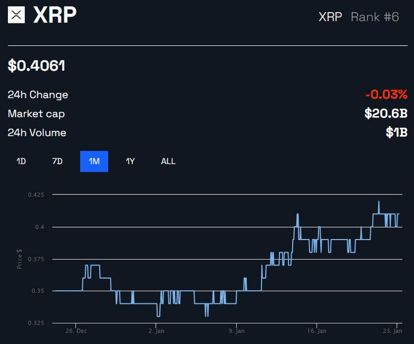 Giá XRP một lần nữa đã chạm mức quan trọng là 0.40 USD và được giữ ở trên mức đó. Hơn nữa, nó đã đạt mức cao nhất trong 2 tháng là 0.415 USD vào ngày 22/1. Tại thời điểm BeInCrypto viết bài, giá XRP được giao dịch ở mức 0.406 USD, sau khi tăng 18% trong hai tuần qua.