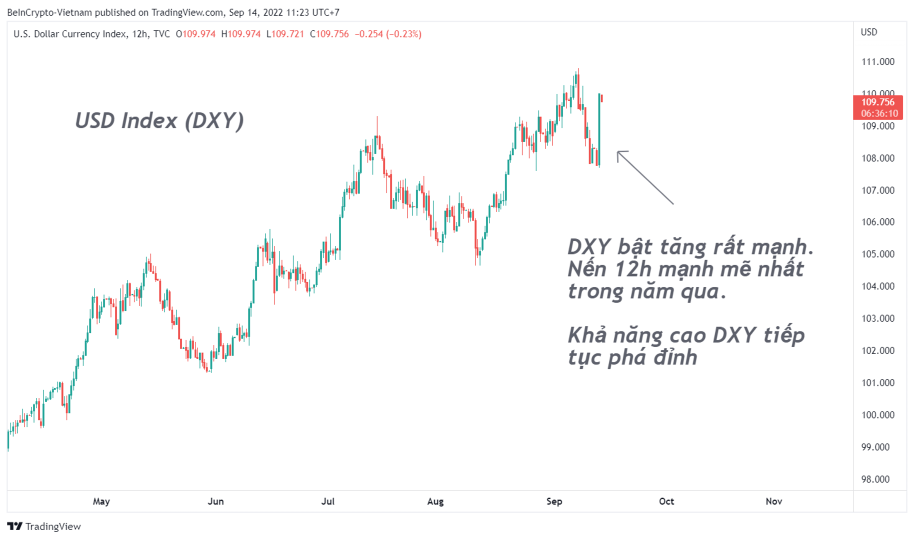 Trước tiên phải kể đến biến động của DXY. Sau sự điều chỉnh được dự báo bởi tín hiệu phân kỳ, DXY tiếp tục trở lại xu hướng tăng mạnh. Và hôm qua DXY vừa tạo xong một nến 12h xanh mạnh mẽ nhất năm qua.