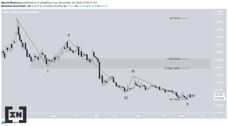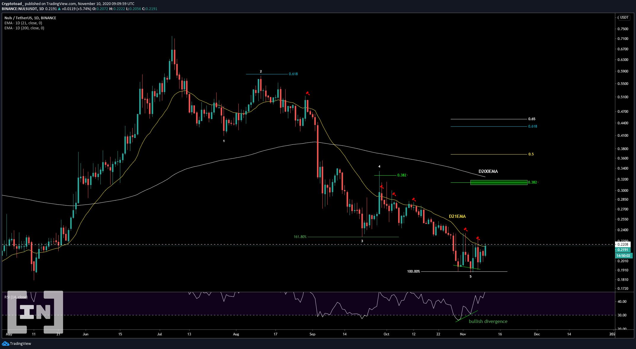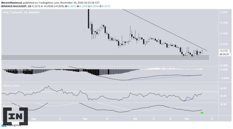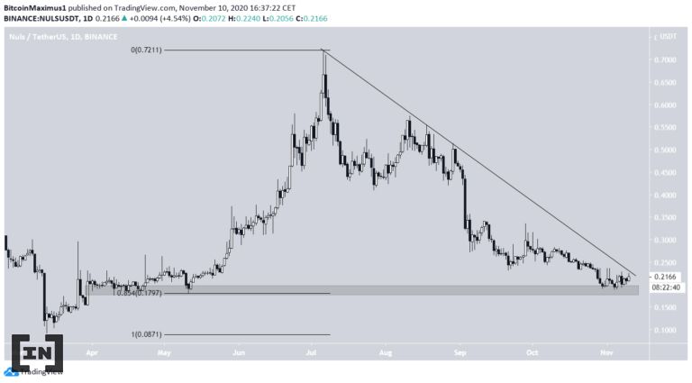 Kể từ đầu tháng 11, NULS đã di chuyển tiến gần đến vùng hỗ trợ 0.18 USD. Nó tương ứng mức Fibo 0.85 cho xu hướng tăng lên. Giá dường như chạm đáy thấp gần nhất sau đó di chuyển đi lên.
