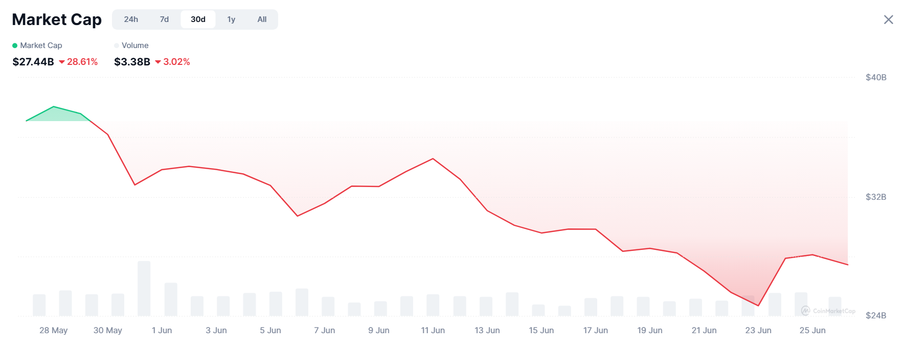 Trong tháng qua, cổ phiếu NVDA đã tăng hơn 13.5%. Ngược lại, thị trường token AI—bao gồm các loại tiền điện tử liên quan đến các dự án AI dựa trên blockchain—đã giảm hơn 28% trong cùng kỳ, theo CoinMarketCap.