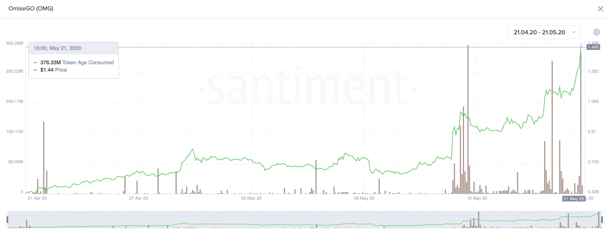 Quan sát chỉ số “Token age consumed index”, có thể thấy một lượng lớn OMG đã được xả chỉ trong vài giờ đồng hồ, dầu giá vẫn cứ tiếp tục tăng.