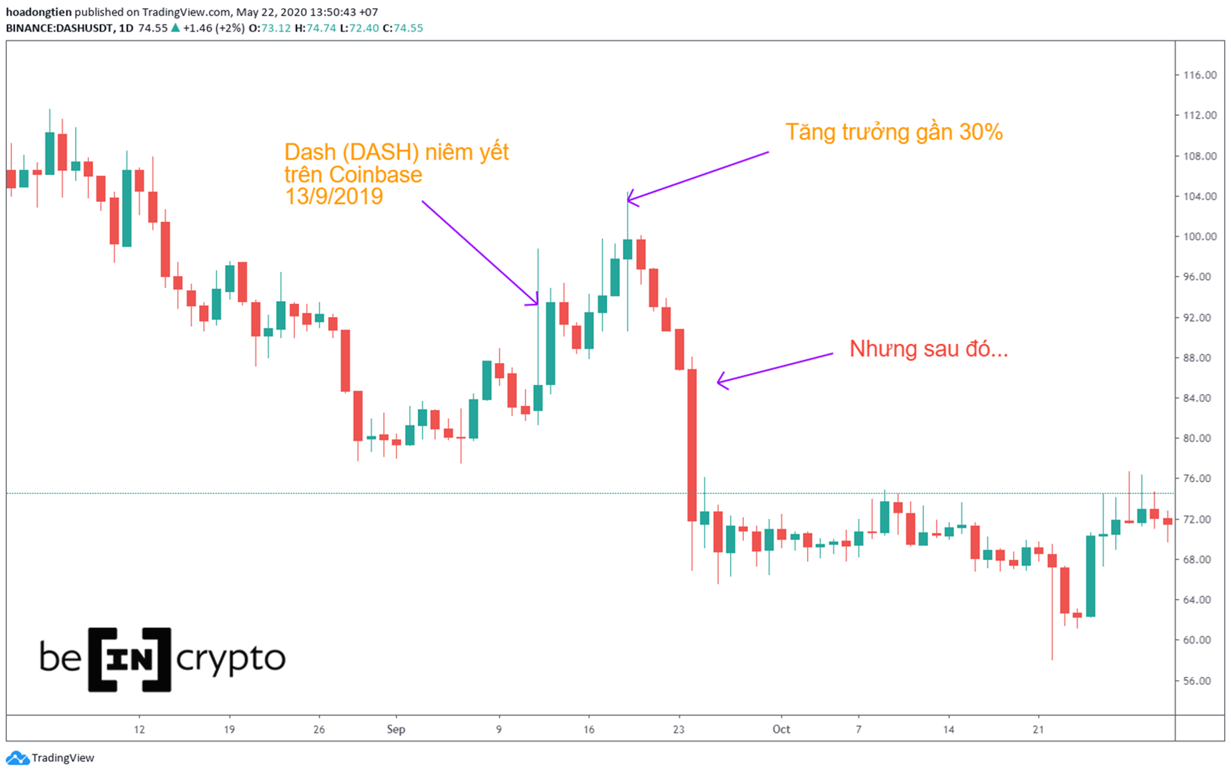 DASH trước và sau khi niêm yết trên Coinbase