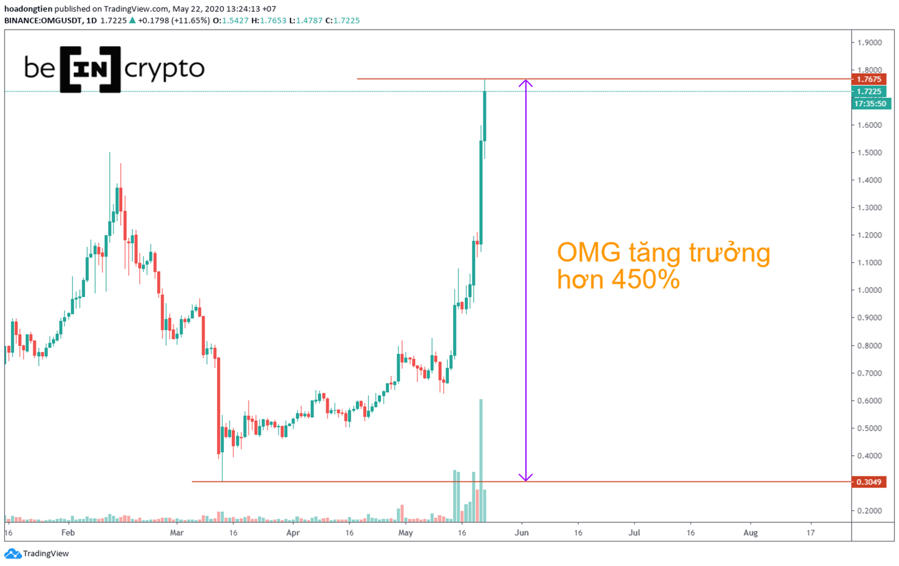 OmiseGO (OMG) đã tăng gấp 3 lần chỉ trong vòng một tuần, nhờ việc được niêm yết trên sàn Coinbase. Nếu tính kể từ đáy của đầu năm đến nay, thì OMG đã đạt mức tăng trưởng lên đến hơn 450% (tính đến thời điểm bài viết này)
