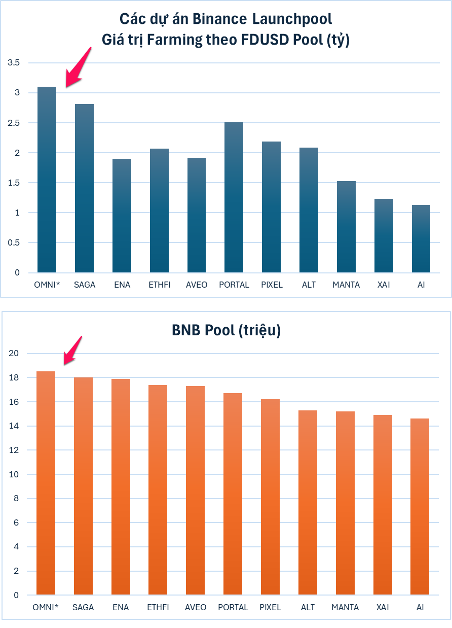 Dù thời gian farming của OMNI vẫn còn hơn một ngày nữa (tính từ thời điểm bài viết), nhưng tổng giá trị FDUSD và BNB tham gia staking đã xô đổ những mức cao của các dự án trước đó. OMNI đã hút được hơn 3.1 tỷ FDUSD và 18.5 triệu BNB, con số này có thể còn tăng thêm cho đến khi kết thúc farming.