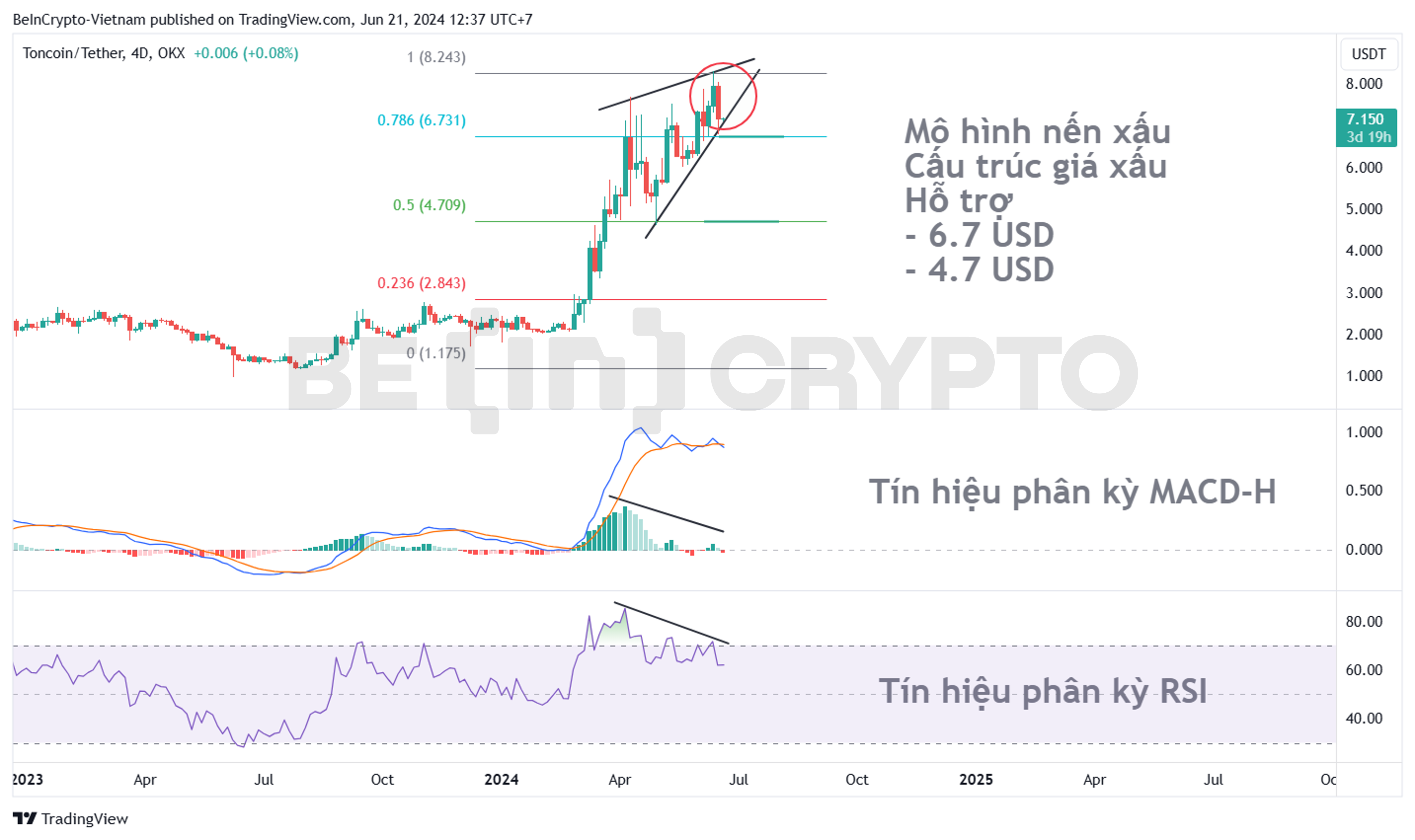 - Về cấu trúc giá, TON khung 4D (như hình trên) đang thể hiện cấu trúc nến xấu, có khả năng là mô hình nến nhấn chìm giảm dự báo những ngày sắp tới giá sẽ giảm. Thêm nữa, mô hình nêm tăng đang rõ ràng hơn và nửa cuối tháng 6 là giai đoạn giá TON về cuối mô hình sắp khẳng định sự điều chỉnh.