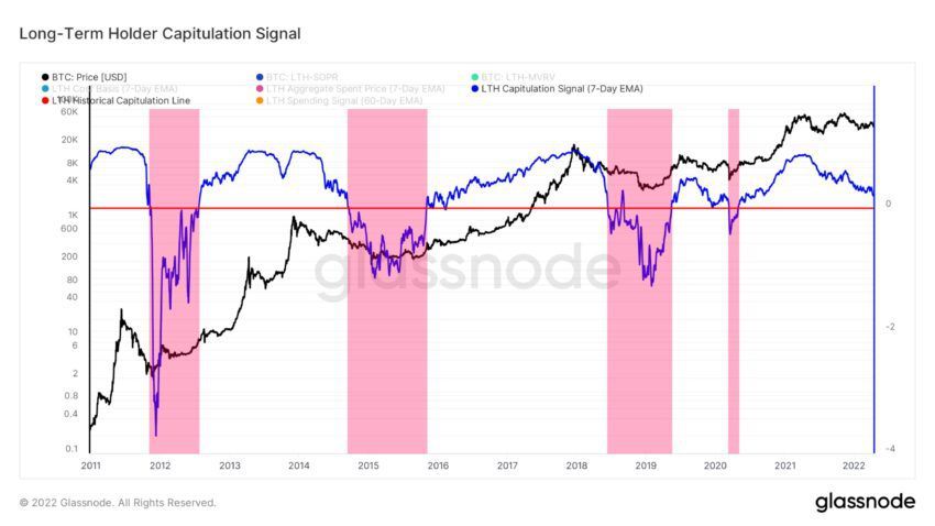 Tín hiệu thu hút người nắm giữ dài hạn cho thấy các khoảng thời gian mà giá BTC sụt giảm đều do bị ảnh hưởng bởi việc bán tháo từ những người nắm giữ lâu dài.