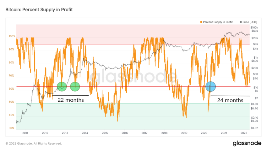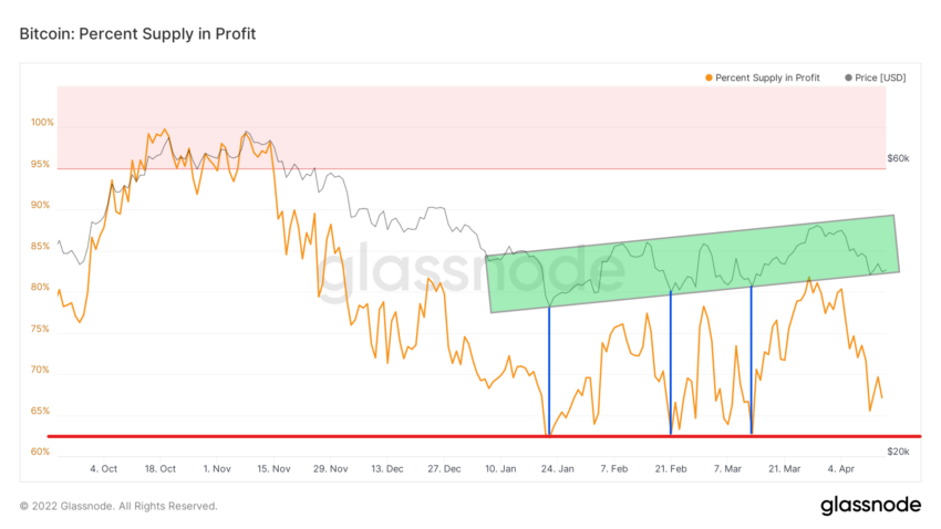 Tính đến năm 2022, chỉ báo Nguồn cung có Lợi nhuận vẫn chưa giảm xuống dưới mức 62.5% (đường màu đỏ). Trong 3 tháng đầu năm nay, chỉ báo này đã bật ra khỏi vùng hỗ trợ quan trọng ba lần, vào ngày 22 tháng 1, ngày 21 tháng 2 và ngày 13 tháng 3, tương ứng với các thời điểm khi giá BTC tụt xuống mức thấp nhất là 34,000 USD, 36,350 USD và 37,555 USD (đường màu xanh lam).