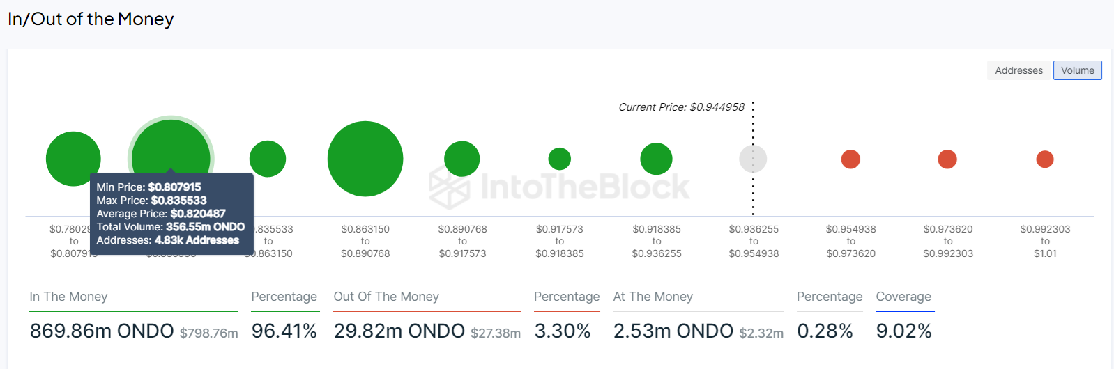 Bên cạnh những dấu hiệu kỹ thuật nói trên, ONDO thể hiện dấu hiệu on-chain tích cực thông qua chỉ báo In/Out of The Money. Chi báo này cho biết lượng tiền vào/ra (xanh/đỏ) tại thời điểm của các mức giá thị trường khác nhau, lượng tiền này thể hiện qua mức độ to nhỏ của hình tròn.