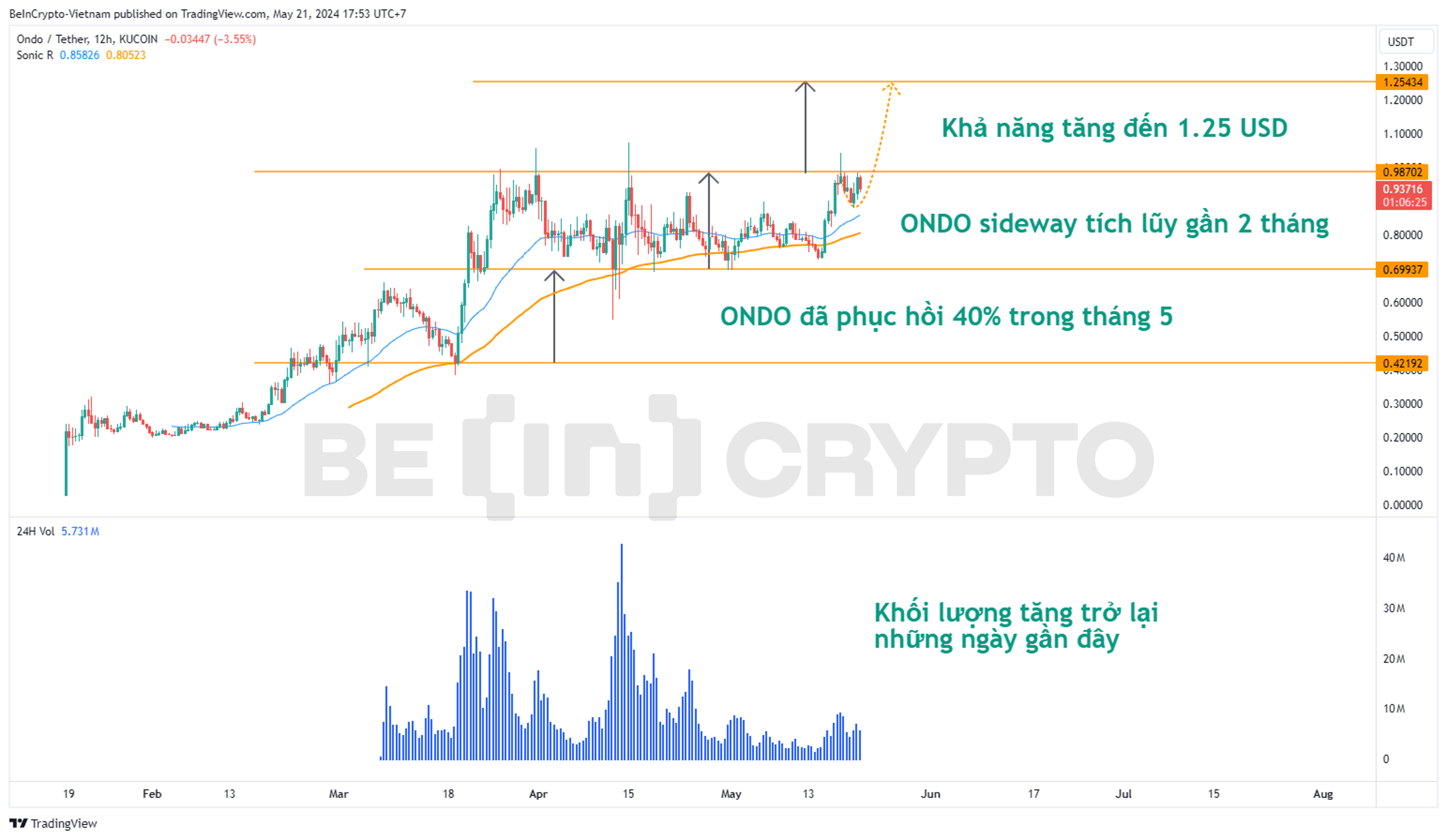 Sponsored- ONDO phục hồi từ hỗ trợ 0.7 USD, với mức tăng 40% trong tháng 5. Trong hai tháng qua, ONDO sideway tích lũy giữa 0.7 USD – 1 USD. Quá trình sideway này vẫn đảm bảo tín hiệu EMA34 nằm trên EMA89 khung 12h.