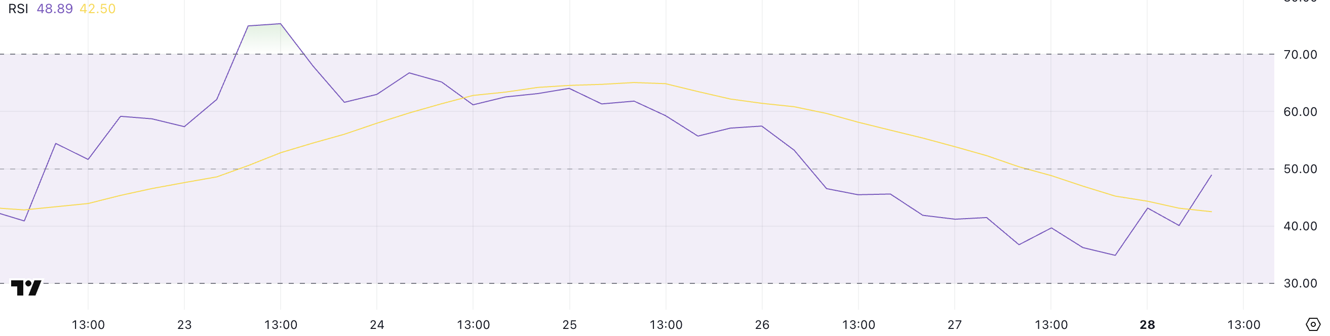 Chỉ số Relative Strength Index (RSI) của Onyxcoin hiện tại là 48.89, sau khi đạt mức cao nhất là 75 chỉ năm ngày trước. RSI đã giảm mạnh xuống 34.88 vào ngày hôm qua nhưng đã phục hồi, cho thấy áp lực bán có thể đang giảm bớt.