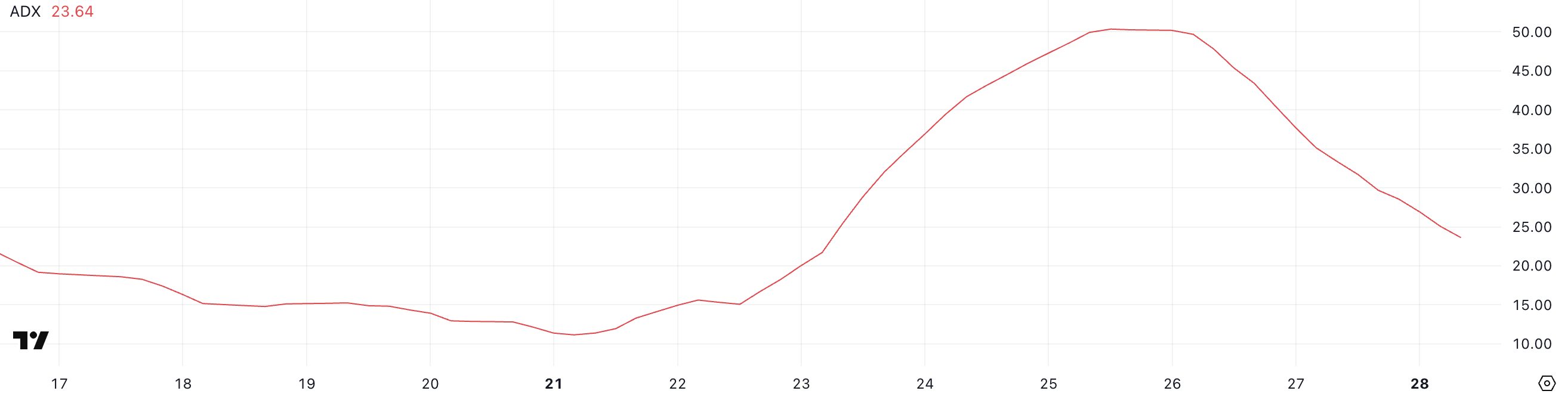 ADX là một chỉ báo kỹ thuật đo lường sức mạnh của một xu hướng, nhưng không phải là hướng đi. Giá trị trên 25 thường gợi ý một xu hướng mạnh, trong khi giá trị dưới 20 chỉ ra một thị trường yếu hoặc không có hướng đi rõ ràng.