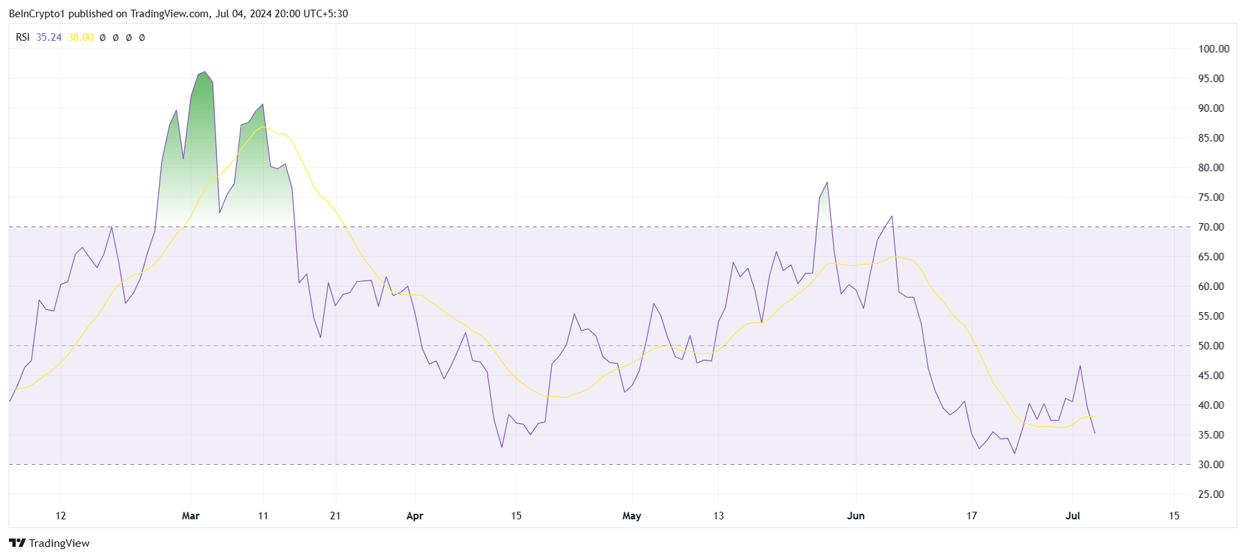 Giá FLOKI tháng 7 có thể giảm trong bối cảnh thị trường chung khá tiêu cực và các nhà đầu tư muốn rút lui. Dấu hiệu của điều này được thể hiện rõ qua Open Interest và chỉ số sức mạnh tương đối (RSI).