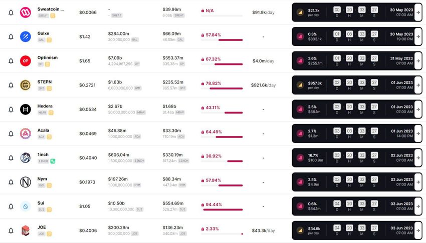 Ngày 01/6, lịch trình unlock token gồm có STEPN, Hedera và Acala và ngày 02/6 sẽ phát hành mã thông báo cho 1inch và Nym.