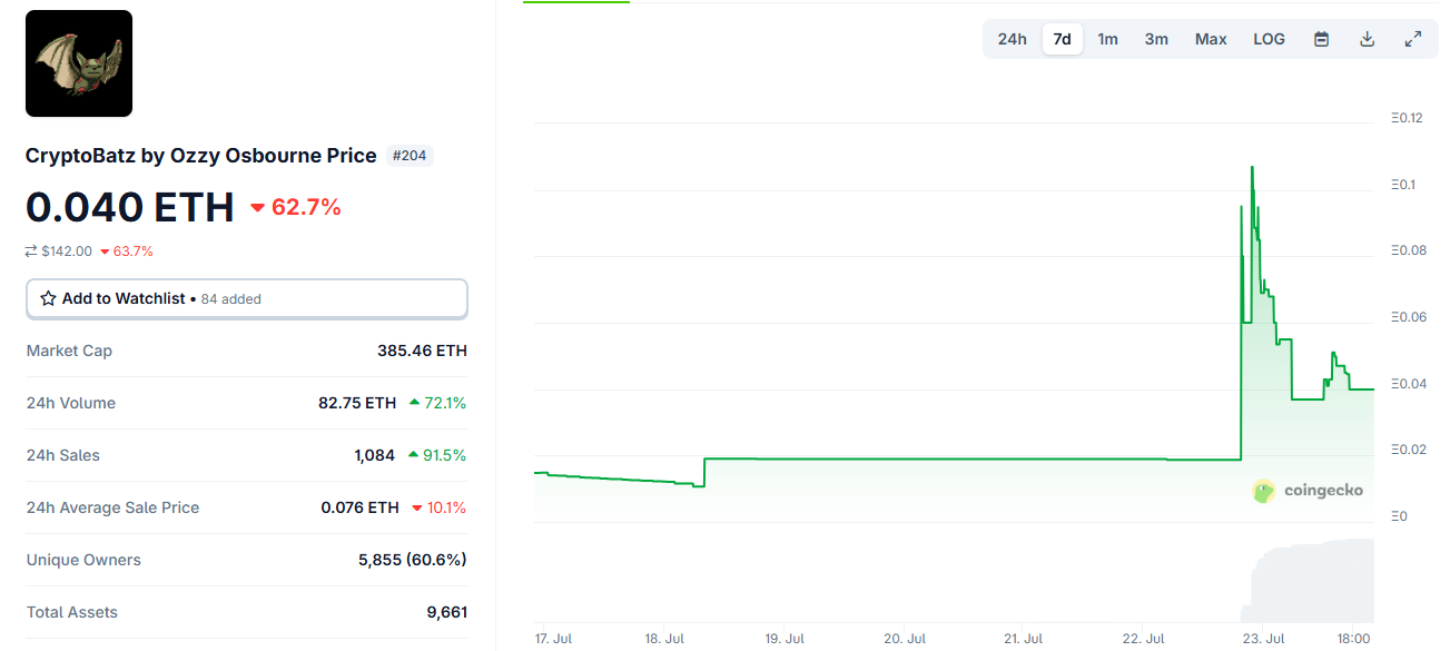 Kể từ khi ra mắt, CryptoBatz đã thu hút người hâm mộ của cả nhạc heavy metal và crypto. Nhưng sau cái chết của Osbourne, các NFT này đã tăng giá trị, đánh dấu sự gia tăng mạnh mẽ trong hoạt động thị trường.