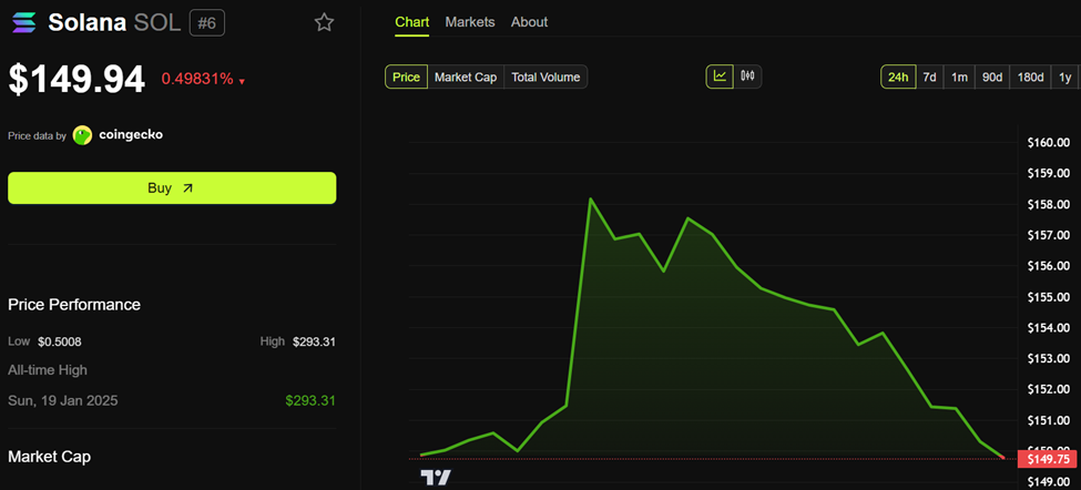 Tuy nhiên, mặc dù có những yếu tố cơ bản tích cực cho blockchain Solana, token SOL của nó đang giảm, giảm 0.49% trong 24 giờ qua. Tại thời điểm viết bài, Solana đang giao dịch ở mức 149.94 USD.