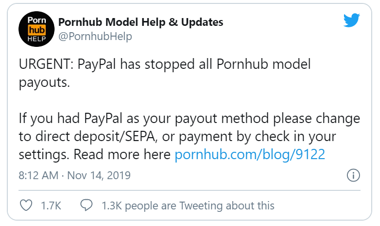 Một trong những lần đóng tài khoản khét tiếng nhất của PayPal là của Pornhub, một website khiêu dâm nổi tiếng. Trong năm 2019, công ty này đã công bố sẽ không còn hỗ trợ thanh toán đối với website này. Quyết định có ý nghĩa quan trọng khi nhiều người liên quan đã nhận được thanh toán nhờ vào cách thức này và do đó, thu nhập của họ sẽ bị ảnh hưởng.