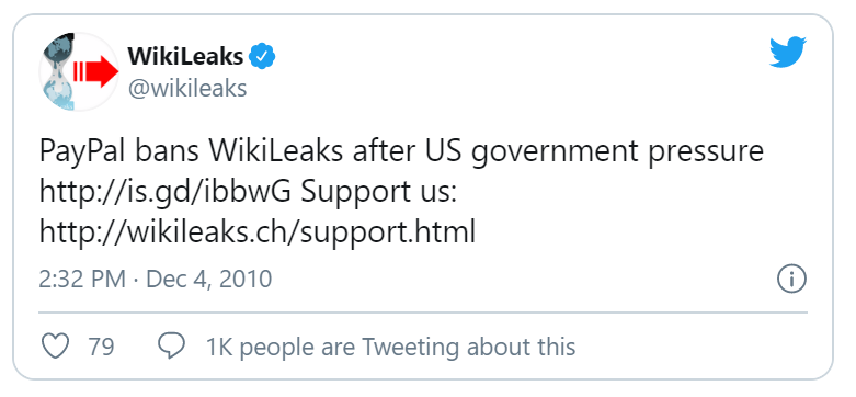 Khi điều này xảy ra, PayPal cho biết lý do là WikiLeaks đã vi phạm chính sách sử dụng có thể chấp nhận được của mình. Chính sách này có điều khoản quy định các tài khoản không thể được sử dụng cho biết kỳ hoạt động nào mà khuyến khích, thúc đẩy, tạo điều kiện hoặc hướng dẫn người khác tham gia vào hoạt động bất hợp pháp. PayPal đã không chỉ rõ hoạt động bất hợp pháp nào đã khiến cho tài khoản WikiLeaks bị ngừng hoạt động, nhưng quyết định đó vẫn được duy trì.