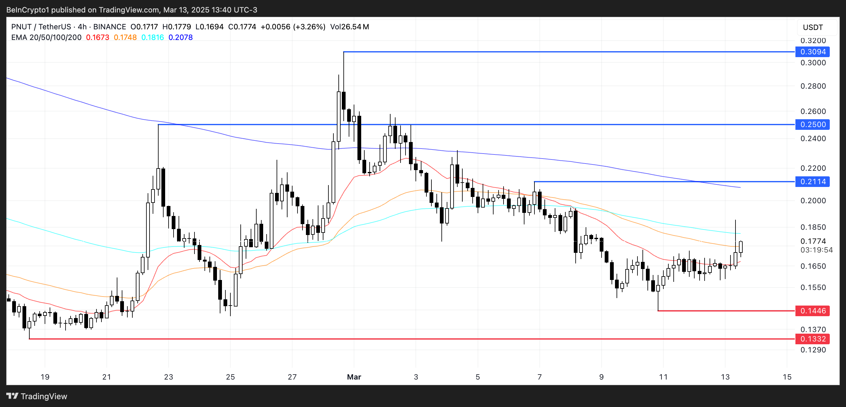 Nếu các đường EMA này tạo thành một giao cắt vàng, PNUT có thể đủ mạnh để kiểm tra mức kháng cự tại 0.211 USD. Một đợt bứt phá trên mức này có thể dẫn đến các mức tăng tiếp theo, với các mục tiêu tiếp theo là 0.25 USD và có thể là 0.309 USD.