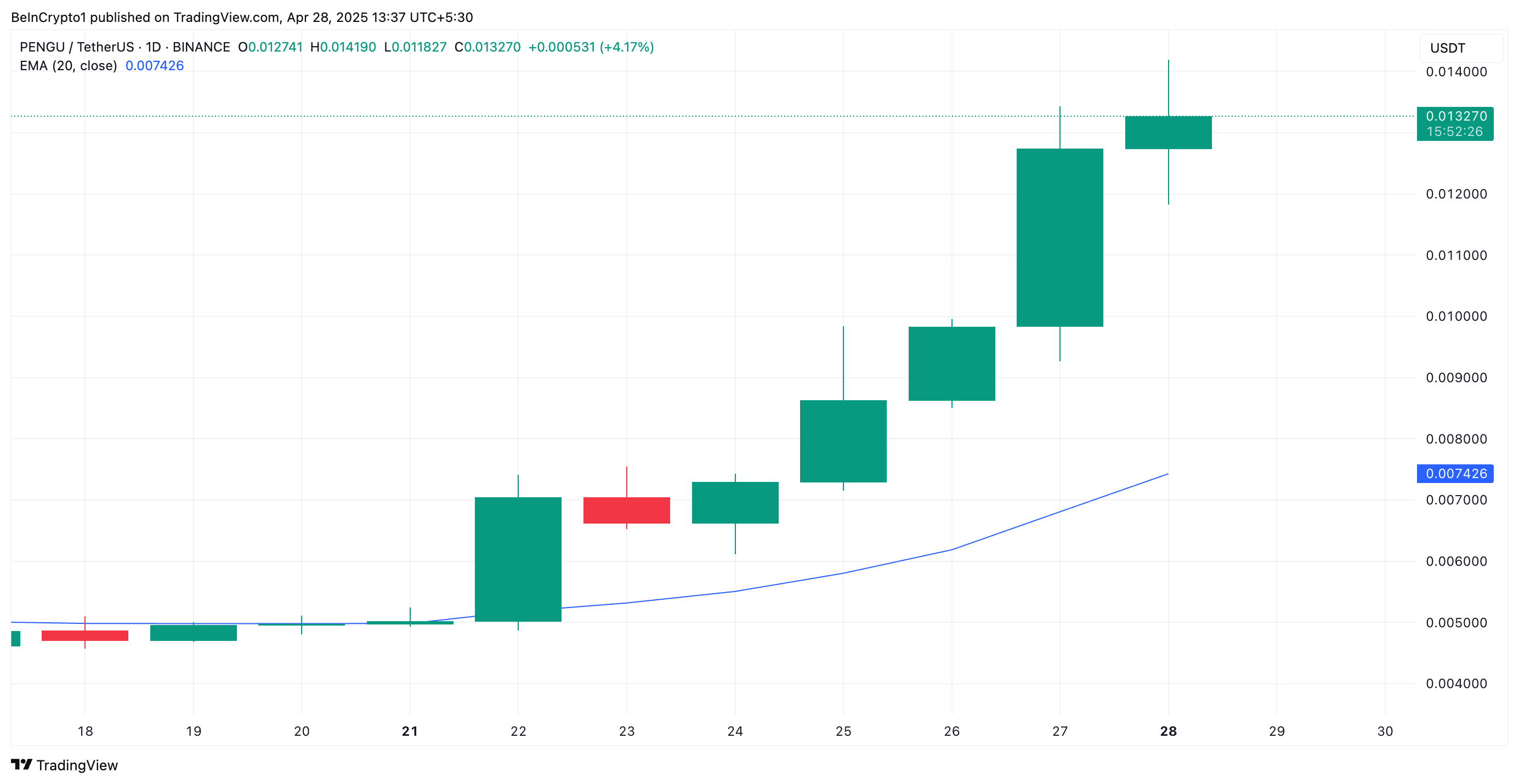 PENGU đã đạt mức cao nhất trong hai tháng là 0.013 USD và hiện đang nằm trên đường trung bình động hàm mũ (EMA) 20 ngày của nó.