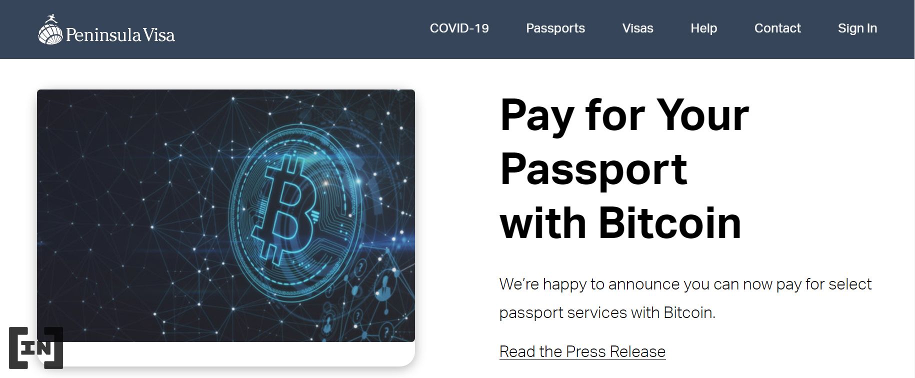 Peninsula Visa, một công ty cấp hộ chiếu và thị thực có trụ sở tại Mỹ. Họ đã đồng ý ứng dụng Bitcoin cho một số dịch vụ mà công ty cung cấp. Báo chí Mỹ đưa tin, công ty sẽ cho phép khách hàng thanh toán thông qua việc gia hạn hộ chiếu. Ngoài ra, các dịch vụ đổi tên và làm hộ chiếu thứ hai sẽ được thanh toán bằng các crypto hàng đầu.