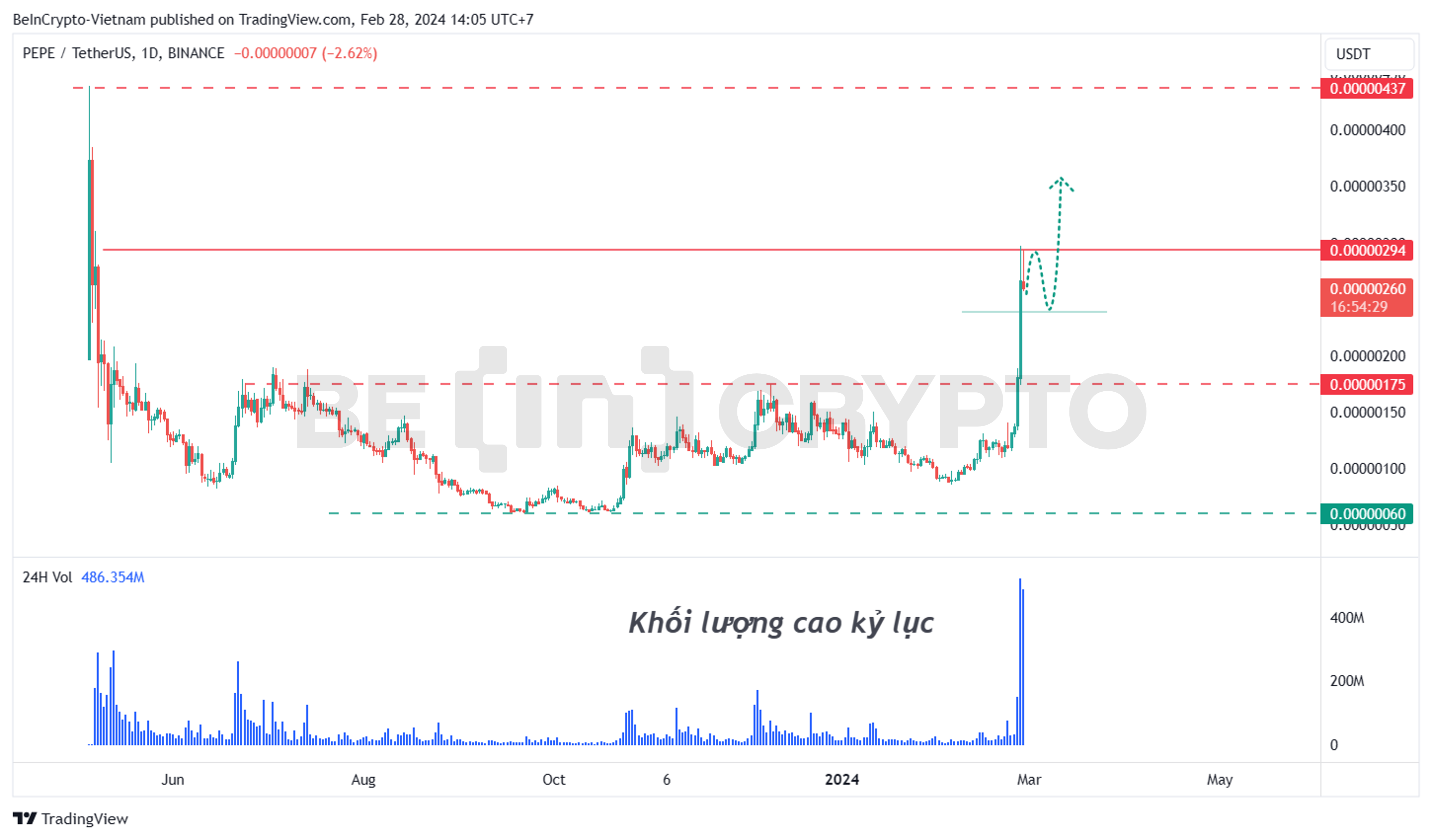 - Dự đoán, giá PEPE có thể duy trì trong biên độ sideway giữa 0.00000240 USD – 0.00000300 USD một vài ngay trước khi tiếp tục nhịp tăng nữa. Target của nhịp tăng tiếp theo có thể đạt đến 0.00000350 USD hoặc trở lại đỉnh cũ tại 0.00000430 USD.