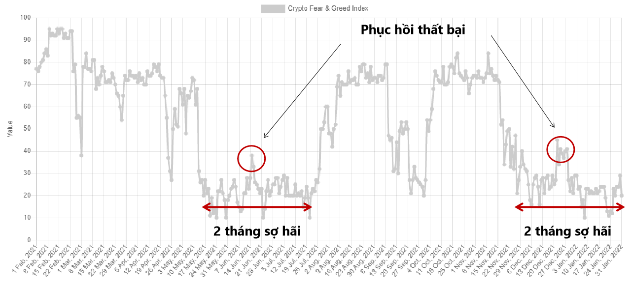 Lịch sử biến động của thước đo tâm lý tham lam và sợ hãi cho thấy 2 tháng là khoảng thời gian đủ dài cho kỳ vọng phục hồi trở lại. Nhiều chỉ báo khác cũng ủng hộ dự đoán này.
