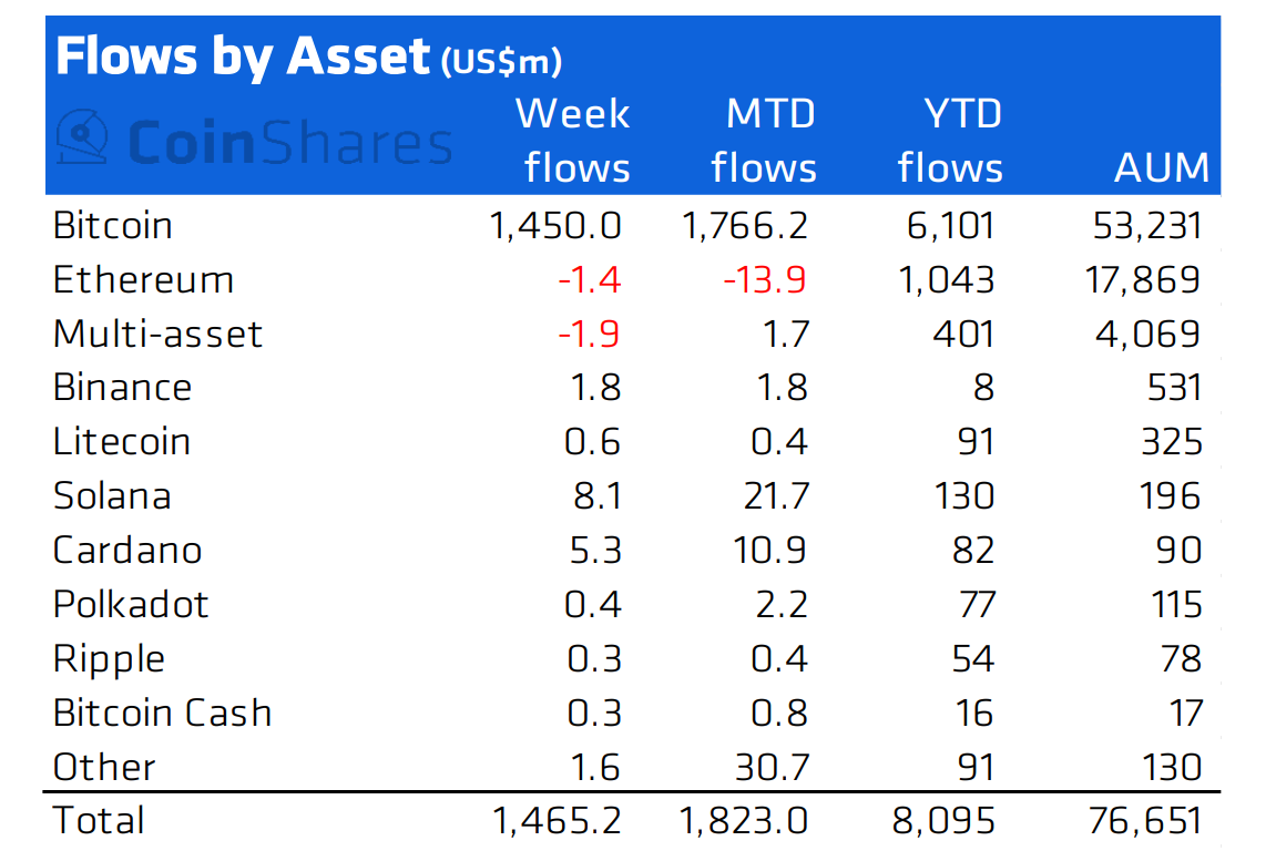Ethereum (ETH) đã chứng kiến dòng tiền đầu tư chảy ra tuần thứ 3 liên tiếp. Lần này có khoảng 1.4 triệu USD được giá trị ETH được bán ra. Các altcoin khác đã chứng kiến dòng tiền đầu tư vào đáng chú ý nhất là Solana (8.1 triệu USD), Cardano (5.3 triệu USD) và Binance (1.8 triệu USD).
